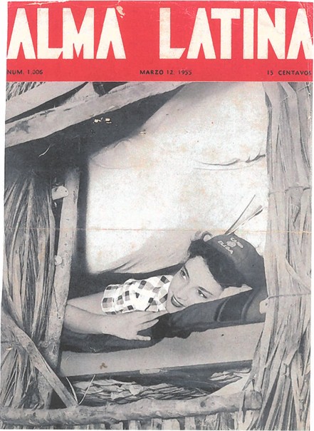 La Senior Vivian Bayouth de Mayagüez, posa para la portada de la revista Alma Latina en uno de los bohíos de paja del campamento.