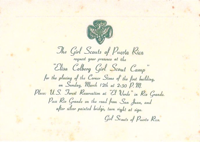 El 8 de julio de 1951 se bendijo el Campamento Elisa Colberg. Para la ocasión se celebró un campamento internacional al que asistieron representantes de 27 países. Vino la Gran Líder Guía, Lady Olave Baden Powell, viuda del fundador de los Boy Scouts. Estas delegadas luego fueron huéspedes de muchas familias puertorriqueñas que abrieron sus puertas y corazones a invitadas tan especiales.
